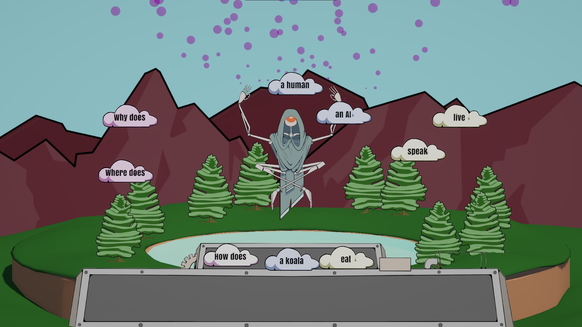 The All-Imagining is an interactive experience meant to convey the environmental costs of generative AI via a virtual program that a user can interact with. Users will form questions using pre-generated sentence fragments, and then a mechanical oracle-esque character on the screen will divine an answer to the question that was generated. This process will repeat, with new sentence fragments each time. However, as the oracle generates these answers, it will drain the life from the surroundings, with the world becoming more barren as the user asks more and more questions.